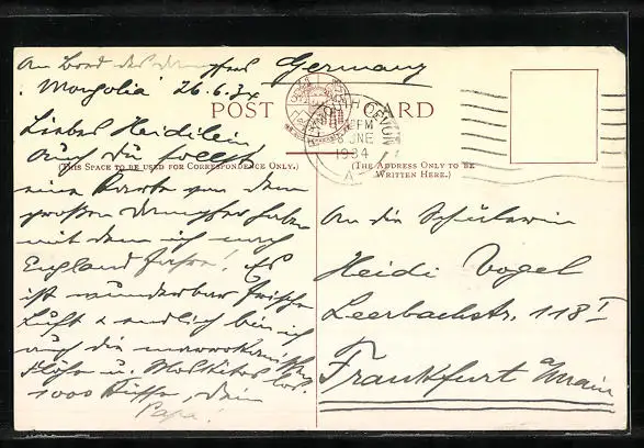 Personenbezogene Daten auf der Rückseite der Karte wurden durch blauen Textmarker unkenntlich gemacht. Die blauen Stellen sind auf die Vorderseite durchgeweicht und wirken sich negativ auf das Postkartenfoto aus