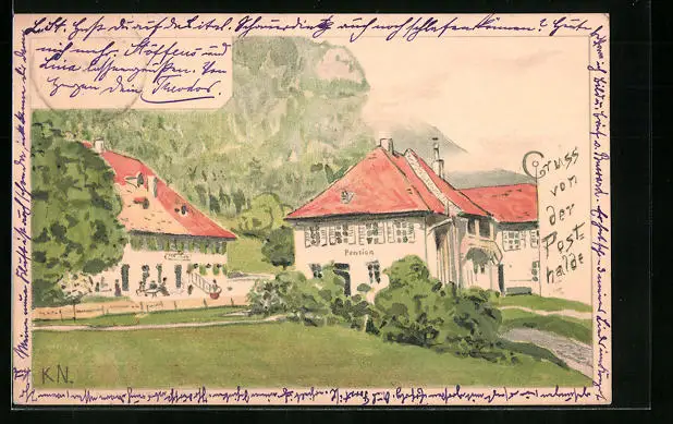 Künstler-AK Posthalde, Ortspartie mit Pension