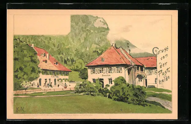 Künstler-AK Posthalde, Ortspartie mit Pension
