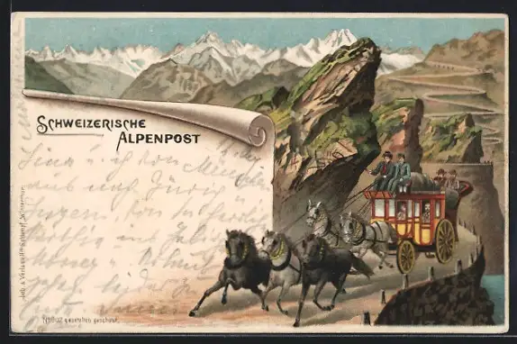 Künstler-AK Postkutsche auf rasanter Fahrt entlang einer Serpentine