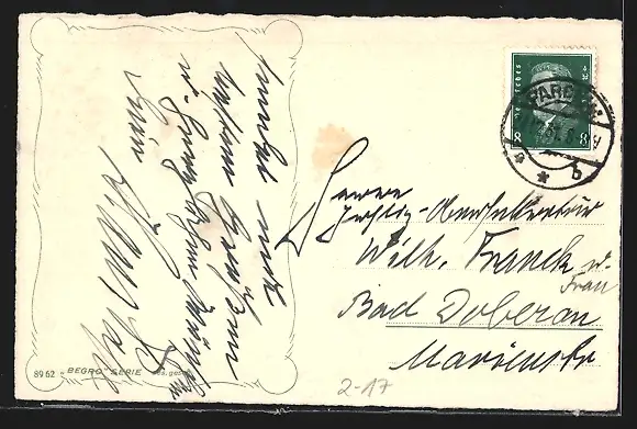 Personenbezogene Daten auf der Rückseite der Karte wurden durch blauen Textmarker unkenntlich gemacht. Die blauen Stellen sind auf die Vorderseite durchgeweicht und wirken sich negativ auf das Postkartenfoto aus