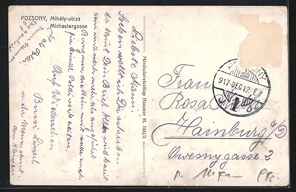 Künstler-AK Pozsony, Michaelergasse mit Geschäften