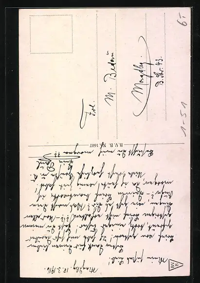 Personenbezogene Daten auf der Rückseite der Karte wurden durch blauen Textmarker unkenntlich gemacht. Die blauen Stellen sind auf die Vorderseite durchgeweicht und wirken sich negativ auf das Postkartenfoto aus