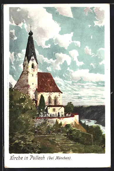 Künstler-AK Pullach /München, Blick auf die Kirche