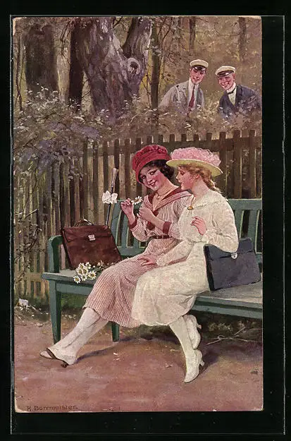 Künstler-AK R. Borrmeister: Er liebt mich, Mädchen sitzen gemütlch auf einer Bank