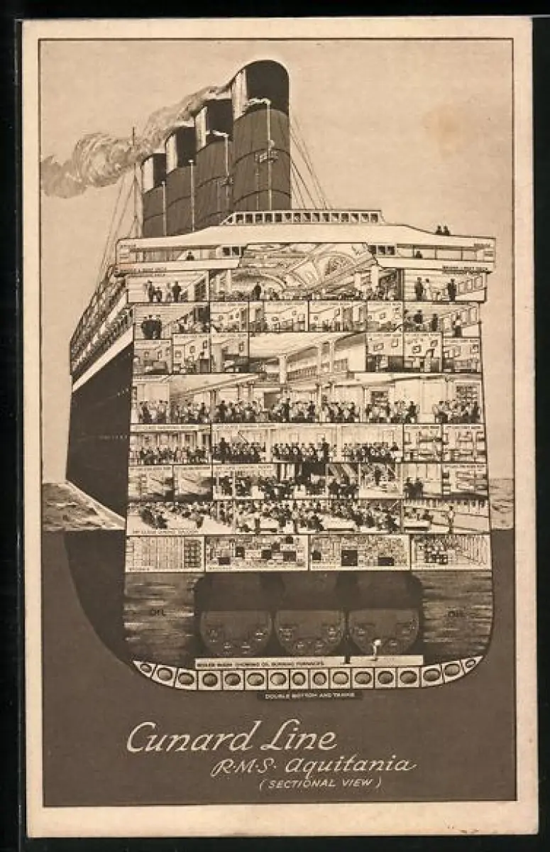 Künstler-AK R.M.S. Aquitania, Sectional View, Ansicht der Aufteilung des Passagierschiffes