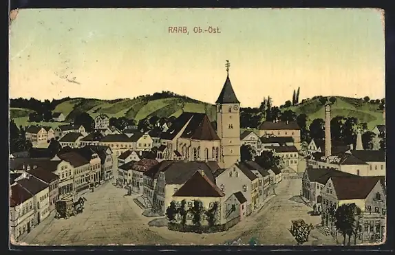 Künstler-AK Raab /Ob.-Öst., Strassenpartie mit Kirche