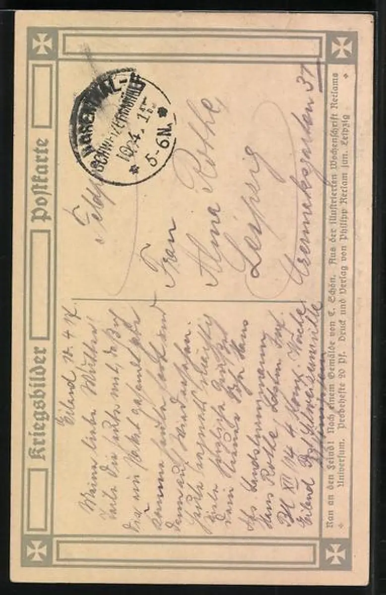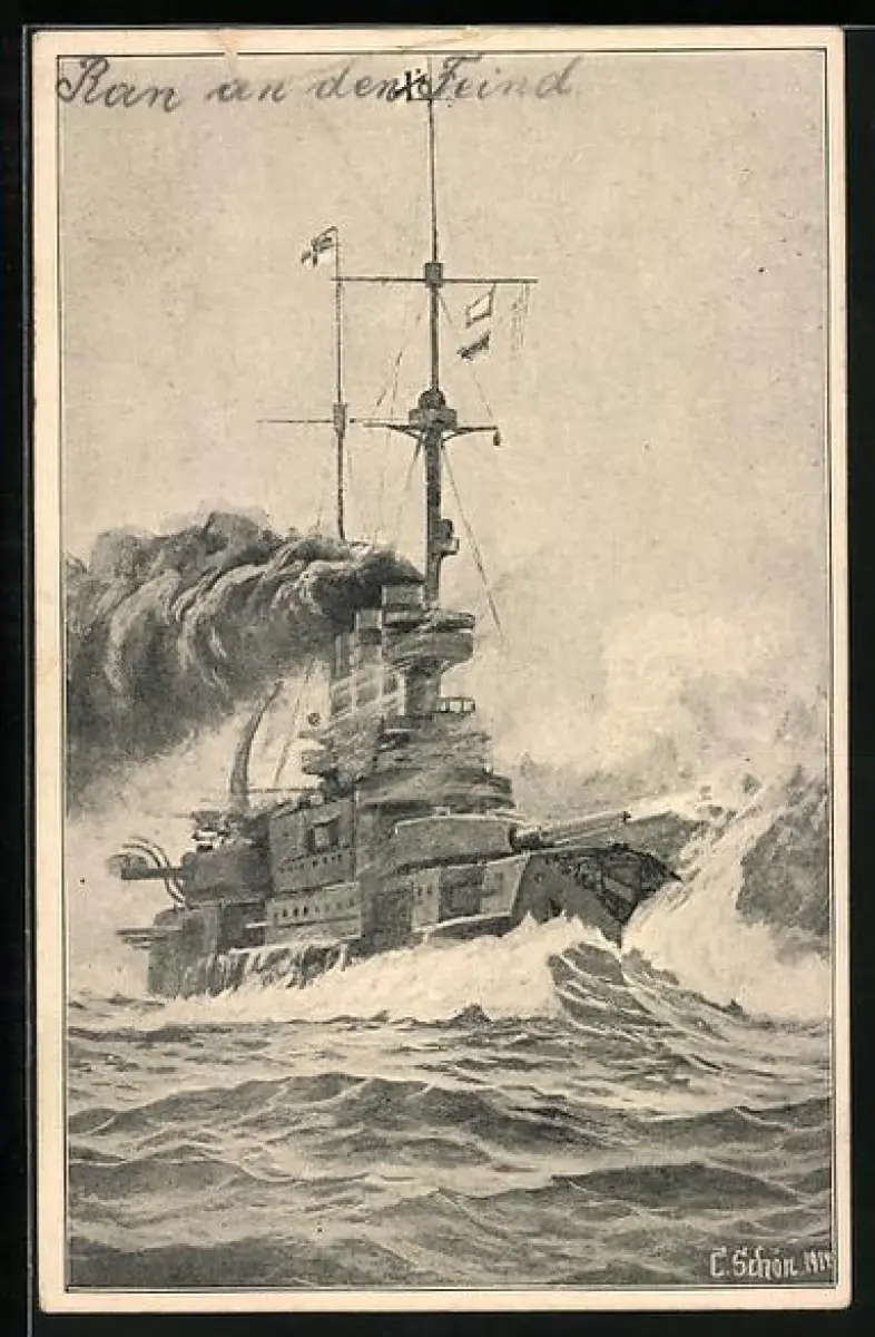 Künstler-AK Ran an den Feind, Kriegsschiff im Gefecht