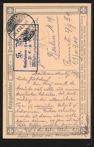 Personenbezogene Daten auf der Rückseite der Karte wurden durch blauen Textmarker unkenntlich gemacht. Die blauen Stellen sind auf die Vorderseite durchgeweicht und wirken sich negativ auf das Postkartenfoto aus