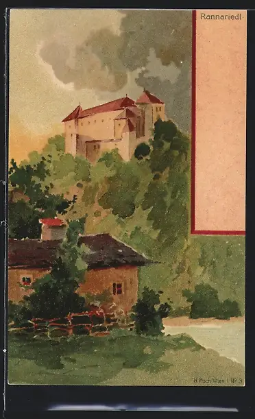 Künstler-AK Rannariedl, Ortsansicht bei Tag