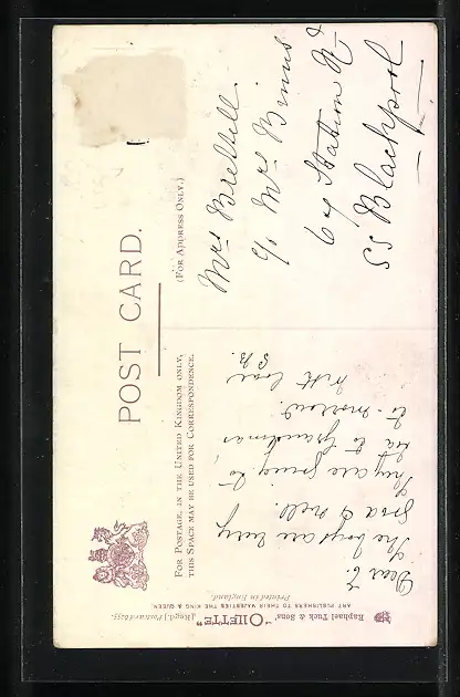 Personenbezogene Daten auf der Rückseite der Karte wurden durch blauen Textmarker unkenntlich gemacht. Die blauen Stellen sind auf die Vorderseite durchgeweicht und wirken sich negativ auf das Postkartenfoto aus