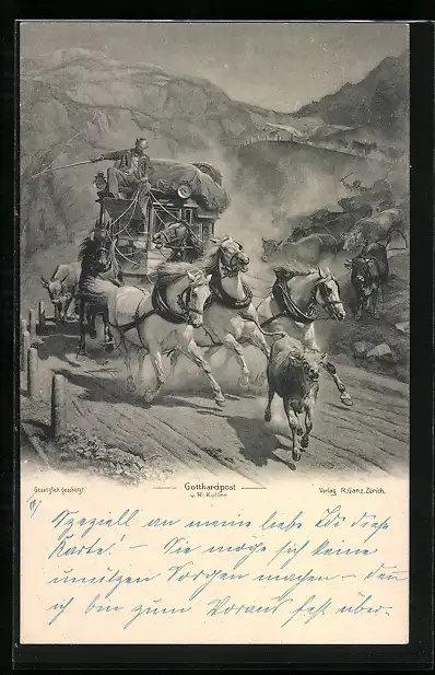 Künstler-AK Rasende Postkutsche der Gotthardpost mit Kühen