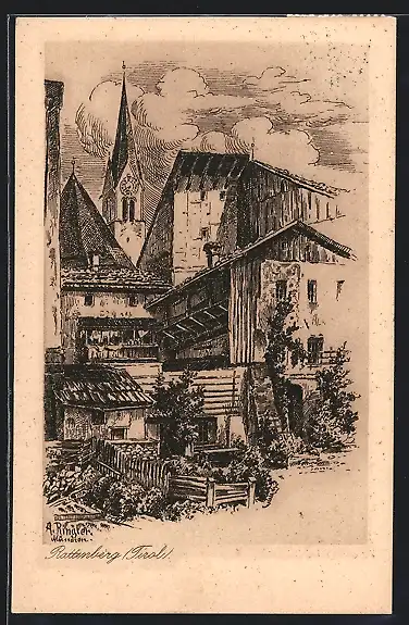 Künstler-AK Rattenberg, Ortsansicht mit Kirchturm