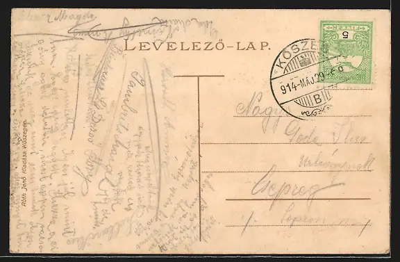 Personenbezogene Daten auf der Rückseite der Karte wurden durch blauen Textmarker unkenntlich gemacht. Die blauen Stellen sind auf die Vorderseite durchgeweicht und wirken sich negativ auf das Postkartenfoto aus