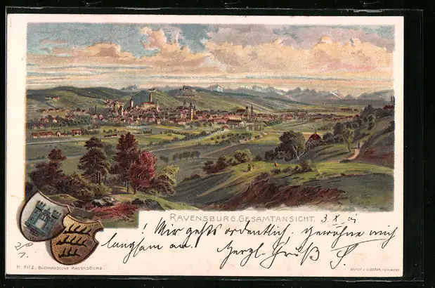 Künstler-AK Ravensburg, Gesamtansicht, Wappen