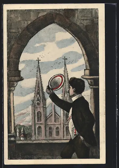 Künstler-AK Regensburg, Student grüsst mit seiner Mütze