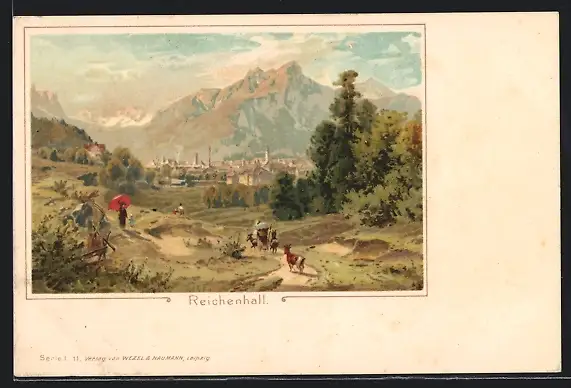 Künstler-AK Reichenhall, Teilansicht und Frau mit Schirm