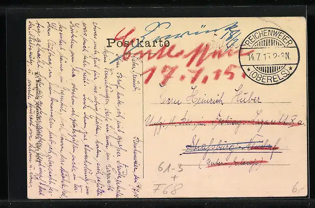 Personenbezogene Daten auf der Rückseite der Karte wurden durch blauen Textmarker unkenntlich gemacht. Die blauen Stellen sind auf die Vorderseite durchgeweicht und wirken sich negativ auf das Postkartenfoto aus
