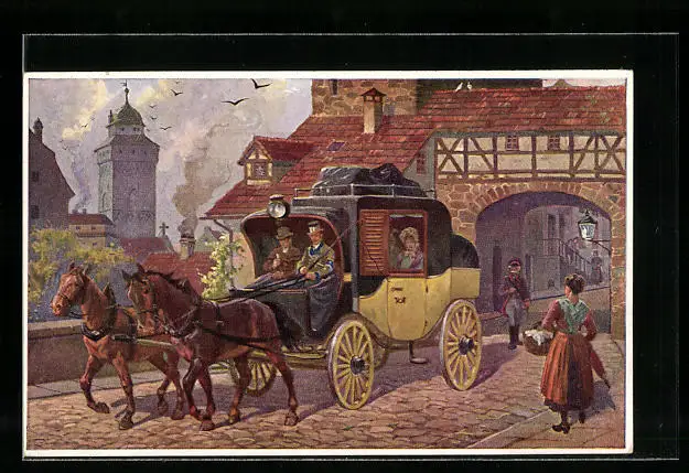 Künstler-AK Reisende in einer Postkutsche am Stadttor