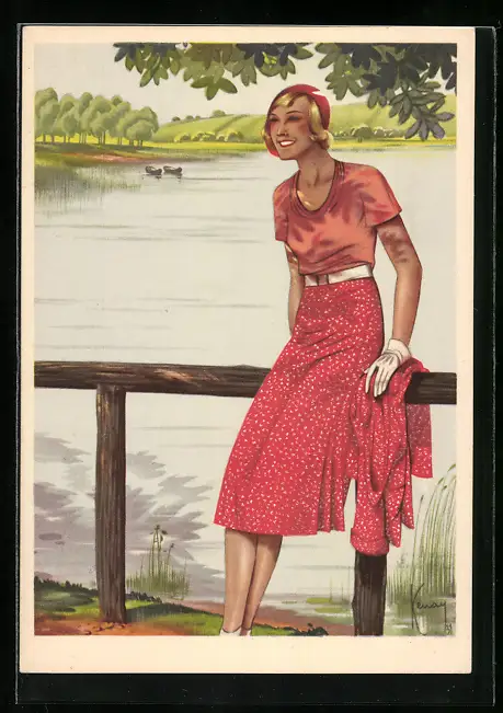 Künstler-AK Reklame für Indanthrenfarbige Stoffe, Hübsche Frau in rotem Kleid