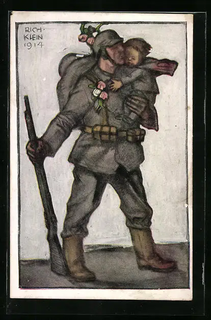 Künstler-AK Richard Klein: Soldat in Uniform mit Kind auf dem Arm
