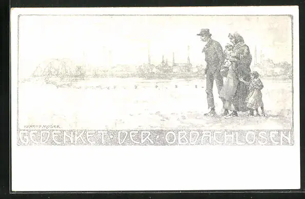 Künstler-AK Richard Moser: Obdachlose Flüchtlinge, Stadt in der Ferne