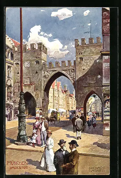Künstler-AK Richard Wagner: München, Karlstor mit Strassenbahn