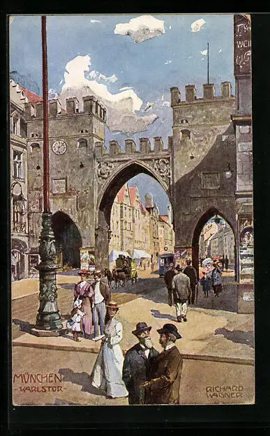 Künstler-AK Richard Wagner: München, Karlstor mit Strassenbahn