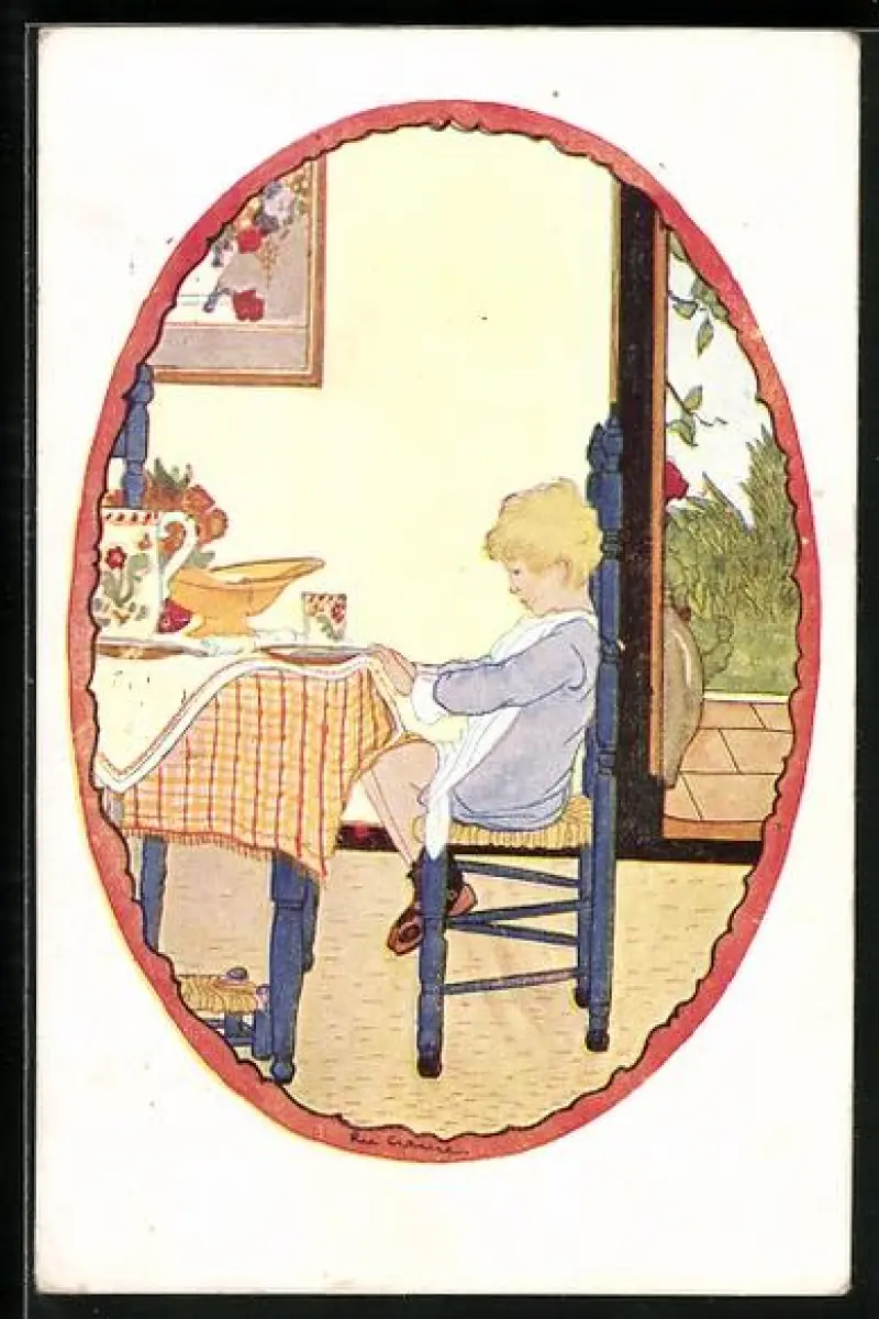 Künstler-AK Rie Cramer: Knabe sitzt am Esstisch