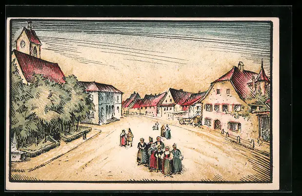 Künstler-AK Riehen, Strassenpartie mit Kirche