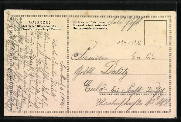 Personenbezogene Daten auf der Rückseite der Karte wurden durch blauen Textmarker unkenntlich gemacht. Die blauen Stellen sind auf die Vorderseite durchgeweicht und wirken sich negativ auf das Postkartenfoto aus