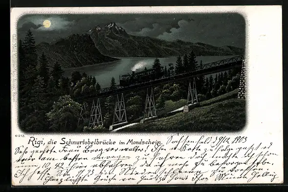 Künstler-AK Rigi, Die Schnurtobelbrücke mit Rigibahn