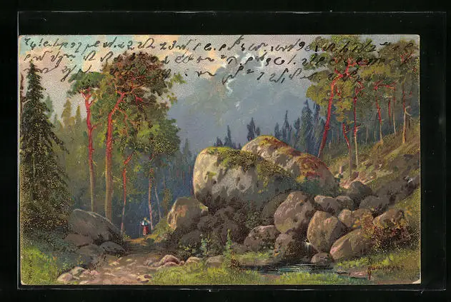 Künstler-AK Robert Kämmerer: Felsformation im Kiefernwald