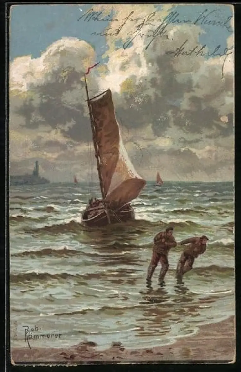 Künstler-AK Robert Kämmerer: Fischer ziehen ihr Boot zum Strand