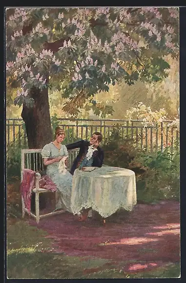 Künstler-AK Robert Kämmerer: Liebespaar am Gartentisch im Frühling