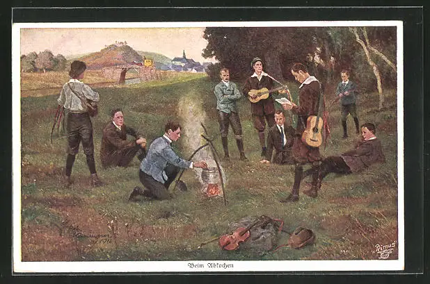 Künstler-AK Robert Kämmerer: Musiker am Waldesrand beim Abkochen