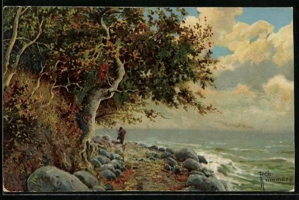 Künstler-AK Robert Kämmerer: Wanderer an einem felsigen Strand