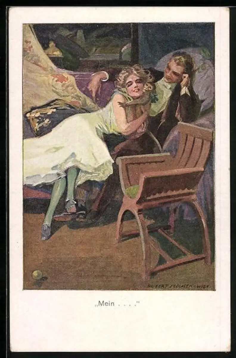 Künstler-AK Robert Sedlacek: Mein..., Frau mit Verehrer und Äffchen
