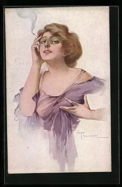 Künstler-AK Roberto Franzoni: Dame in freizügigem Kleid raucht eine Zigarette