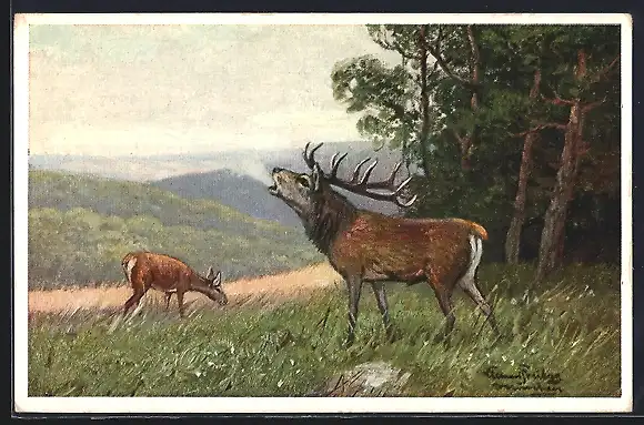 Künstler-AK Röhrender kapitaler Hirsch und äsende Kuh