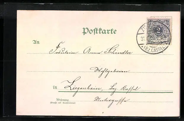 Personenbezogene Daten auf der Rückseite der Karte wurden durch blauen Textmarker unkenntlich gemacht. Die blauen Stellen sind auf die Vorderseite durchgeweicht und wirken sich negativ auf das Postkartenfoto aus
