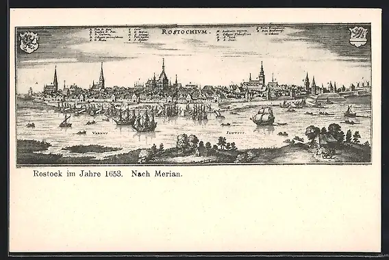 Künstler-AK Rostock, Alte Stadtansicht nach Merian von 1653