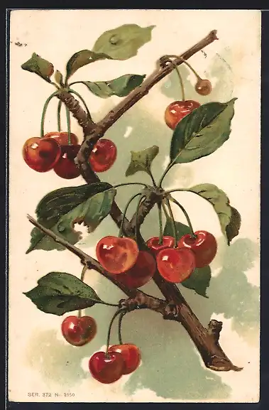 Künstler-AK Rote Kirschen hängen an einem Zweig