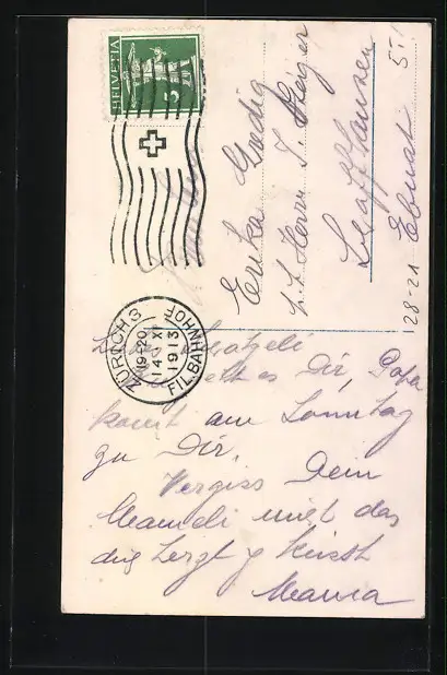 Personenbezogene Daten auf der Rückseite der Karte wurden durch blauen Textmarker unkenntlich gemacht. Die blauen Stellen sind auf die Vorderseite durchgeweicht und wirken sich negativ auf das Postkartenfoto aus