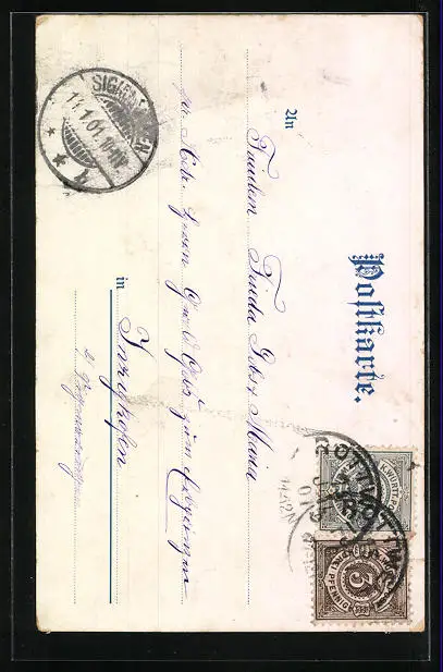 Personenbezogene Daten auf der Rückseite der Karte wurden durch blauen Textmarker unkenntlich gemacht. Die blauen Stellen sind auf die Vorderseite durchgeweicht und wirken sich negativ auf das Postkartenfoto aus