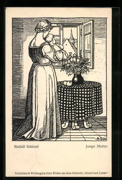 Künstler-AK Rudolf Schiestl: Junge Mutter mit Kind auf dem Arm