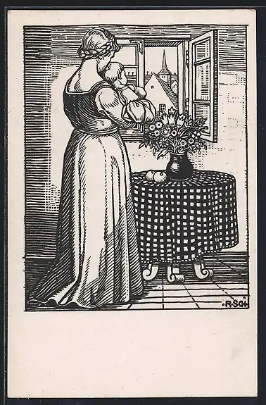 Künstler-AK Rudolf Schiestl: Junge Mutter mit Kind auf dem Arm