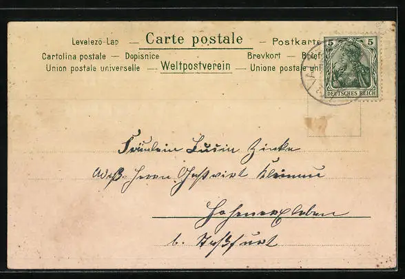 Personenbezogene Daten auf der Rückseite der Karte wurden durch blauen Textmarker unkenntlich gemacht. Die blauen Stellen sind auf die Vorderseite durchgeweicht und wirken sich negativ auf das Postkartenfoto aus