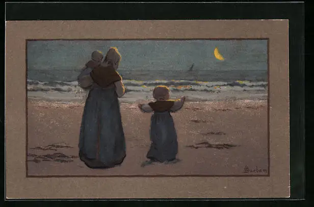 Künstler-AK S. Barham: Mutter mit Kindern nachts am Strand