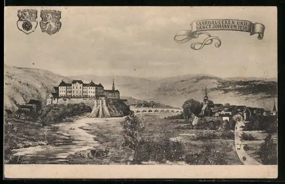 Künstler-AK Saarbrücken, Ortsansicht mit St. Johann um 1750